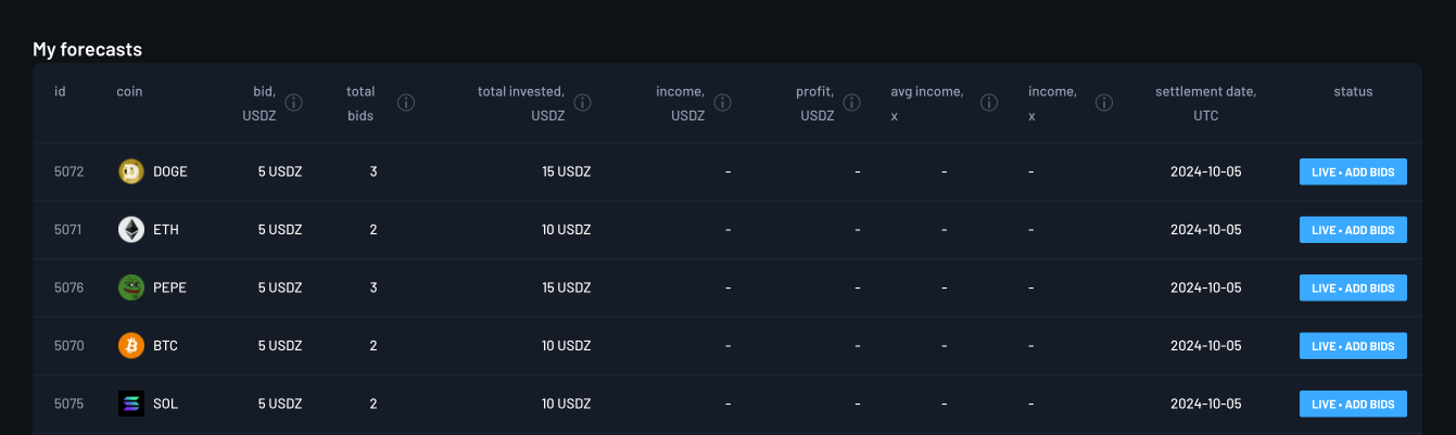 My forecasts section: A table with full data on all the forests you have made. If you have not made forecasts yet, this table will not be in your profile.