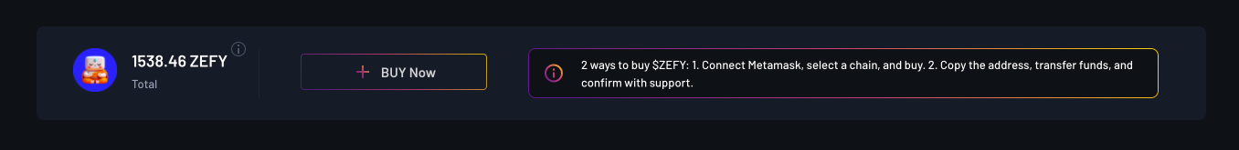 Total, ZEFY: This refers to the value of all ZEFY token funds tagged to your account, including Available Balance, funds reserved in bids, bonus gifts, and referral rewards.
