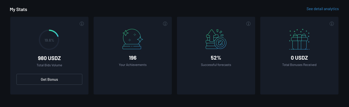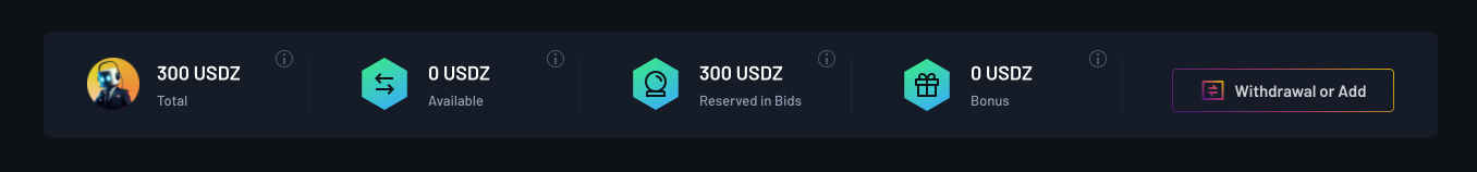 Total, USDZ: This refers to the value of all UZDZ funds tagged to your account, including Available Balance, funds reserved in bids, bonus gifts, and referral rewards.