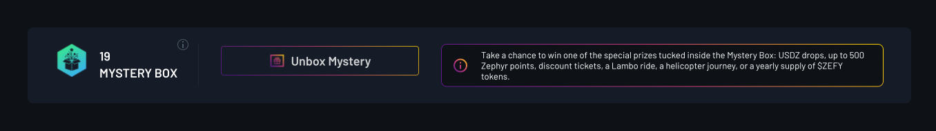 MYSTERY BOX: The number of Mystery Boxes a user has won in the Community Campaign. The contents of the Mystery Box can vary by campaign stage and may include, but are not limited to, USDZ drops, Discount Tickets, etc. To activate, click on the button Unbox Mystery