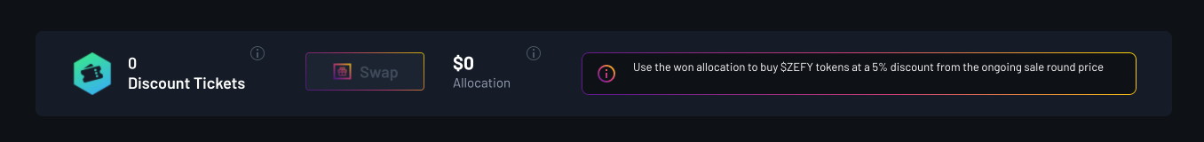 Discount Tickets: The count of $100 allocation tickets allows users to buy $ZEFY tokens with a 5% discount during the presale rounds. Be sure to click the "Swipe" button to unlock them before buying.